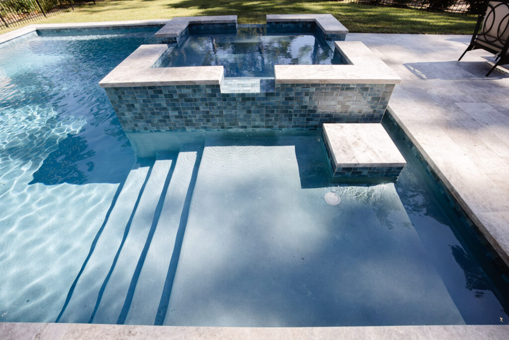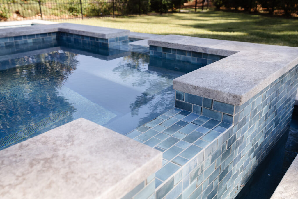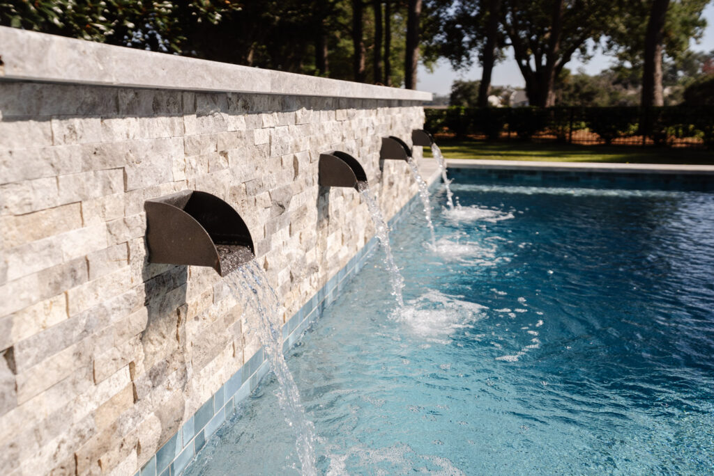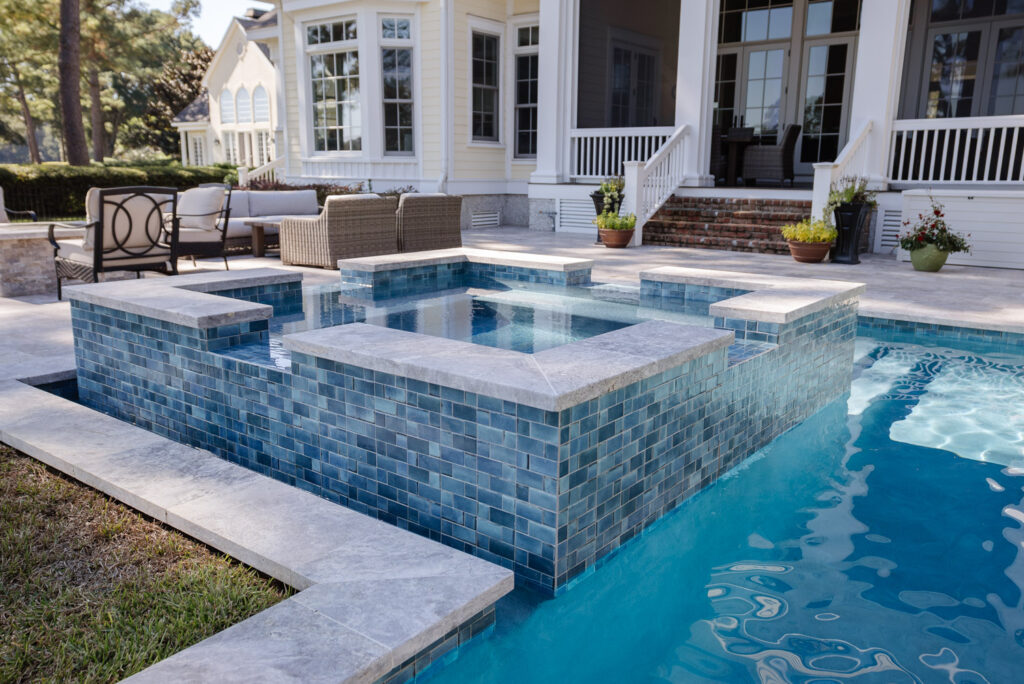 Designed for both adults and their water-loving Labradors, the main pool includes a deep-end bench ideal for lounging and play. A raised scupper wall anchors the space, adding a tranquil soundtrack to the setting. Every material was thoughtfully selected to complement the Lowcountry-style architecture and the home’s interior palette, ensuring a cohesive and inviting outdoor retreat.