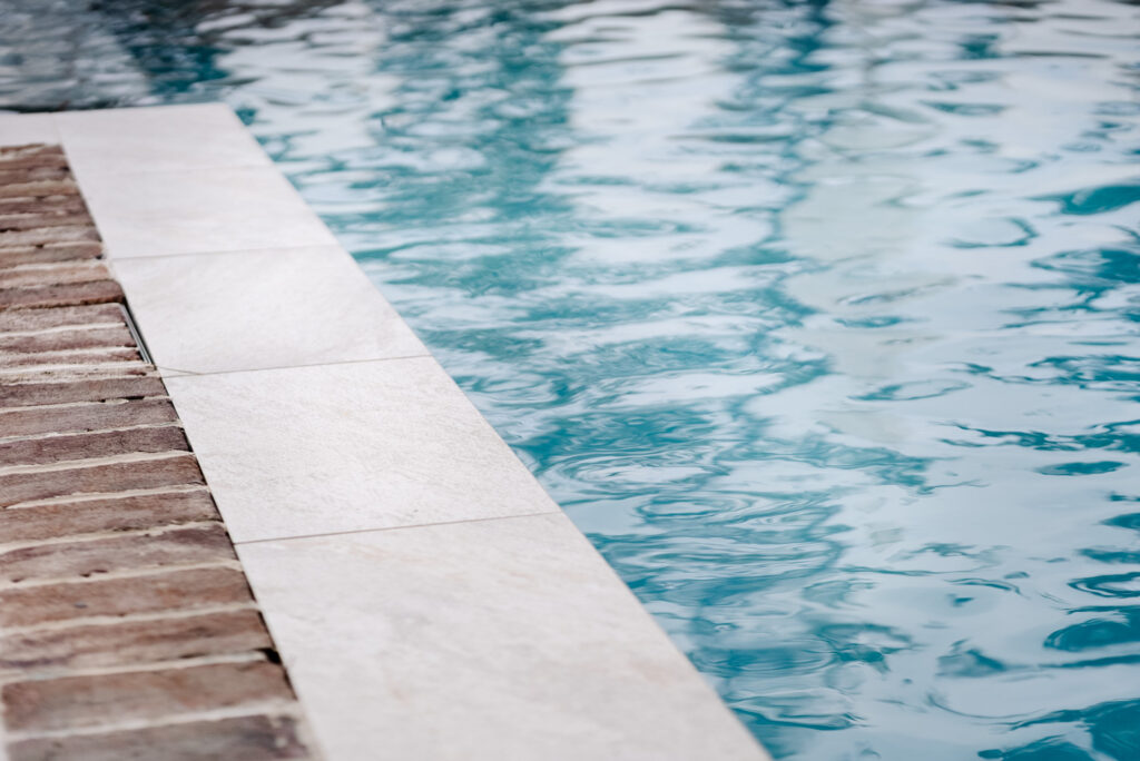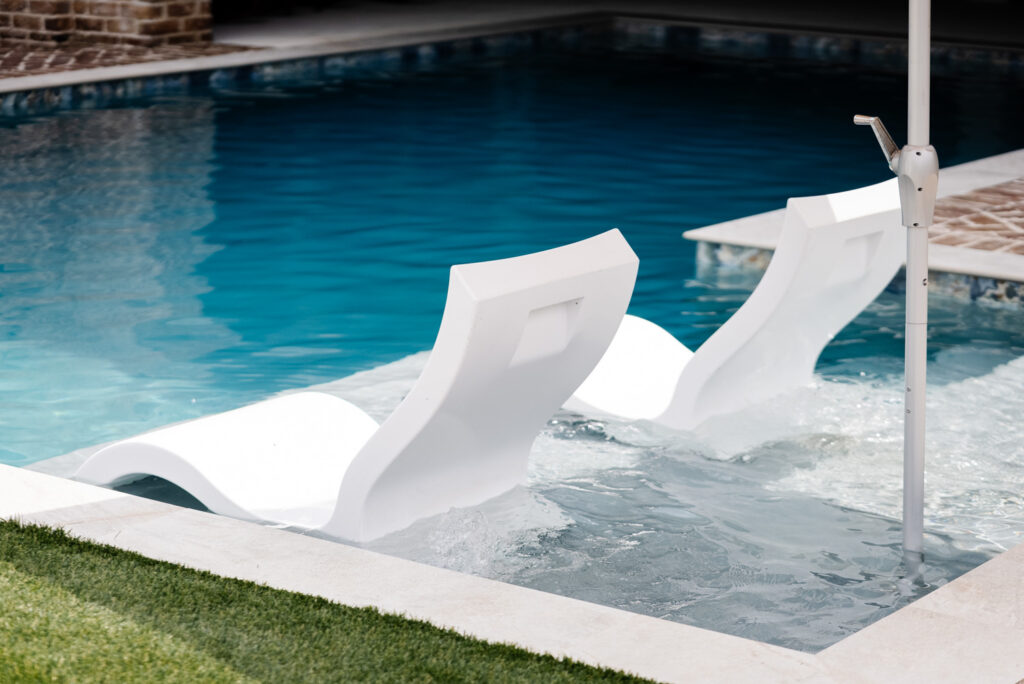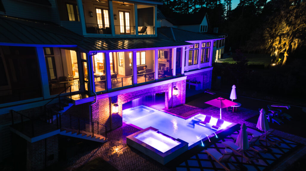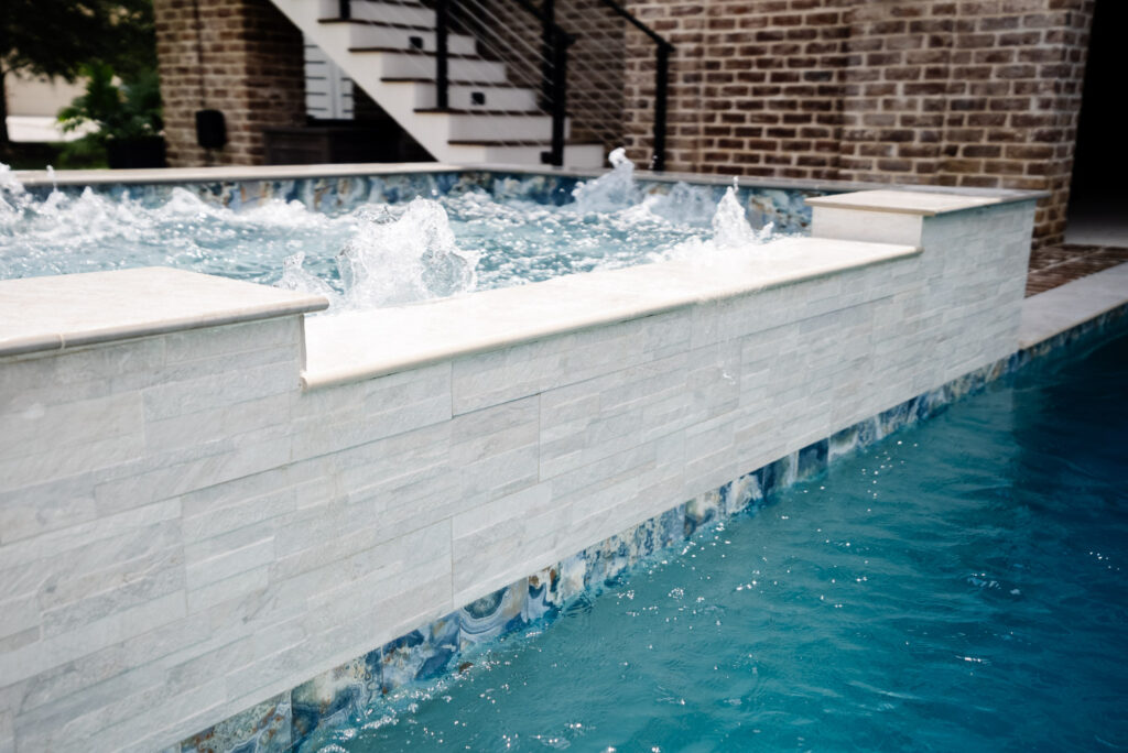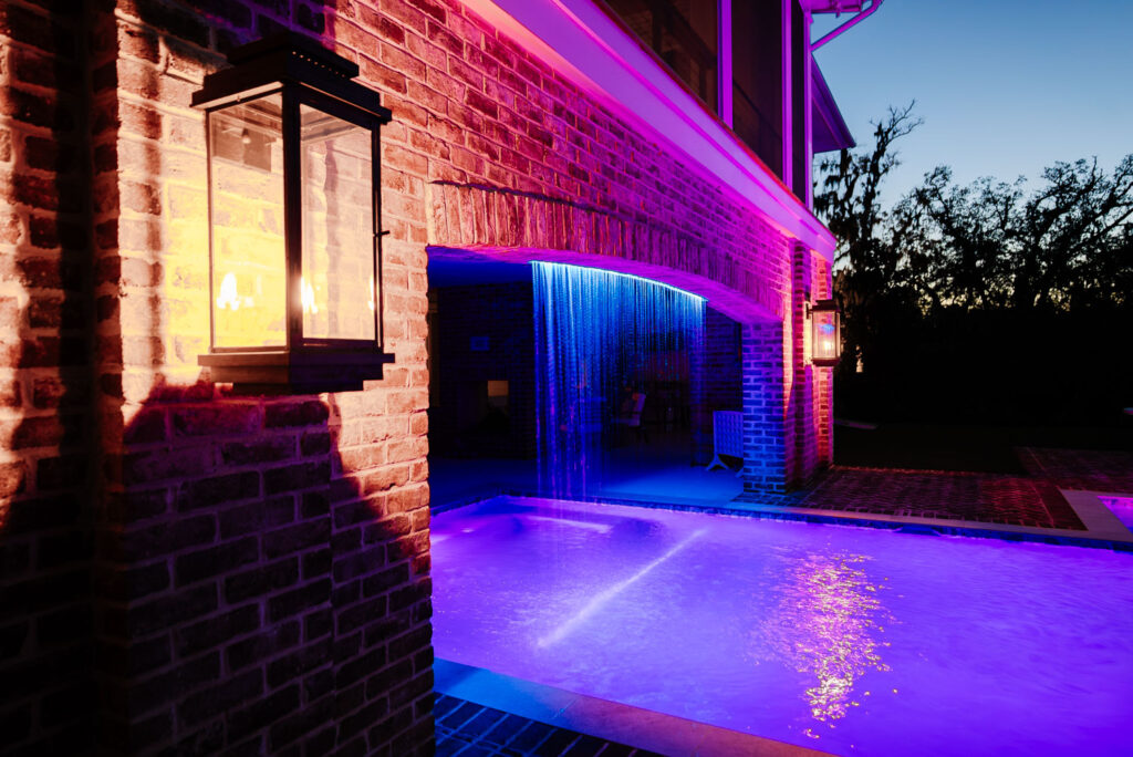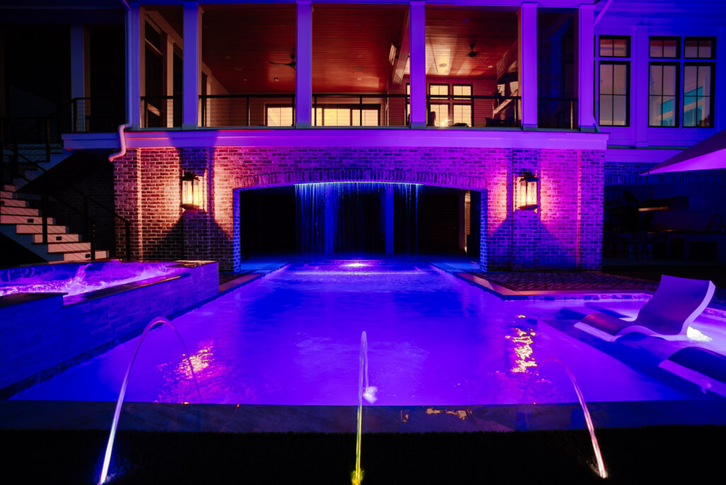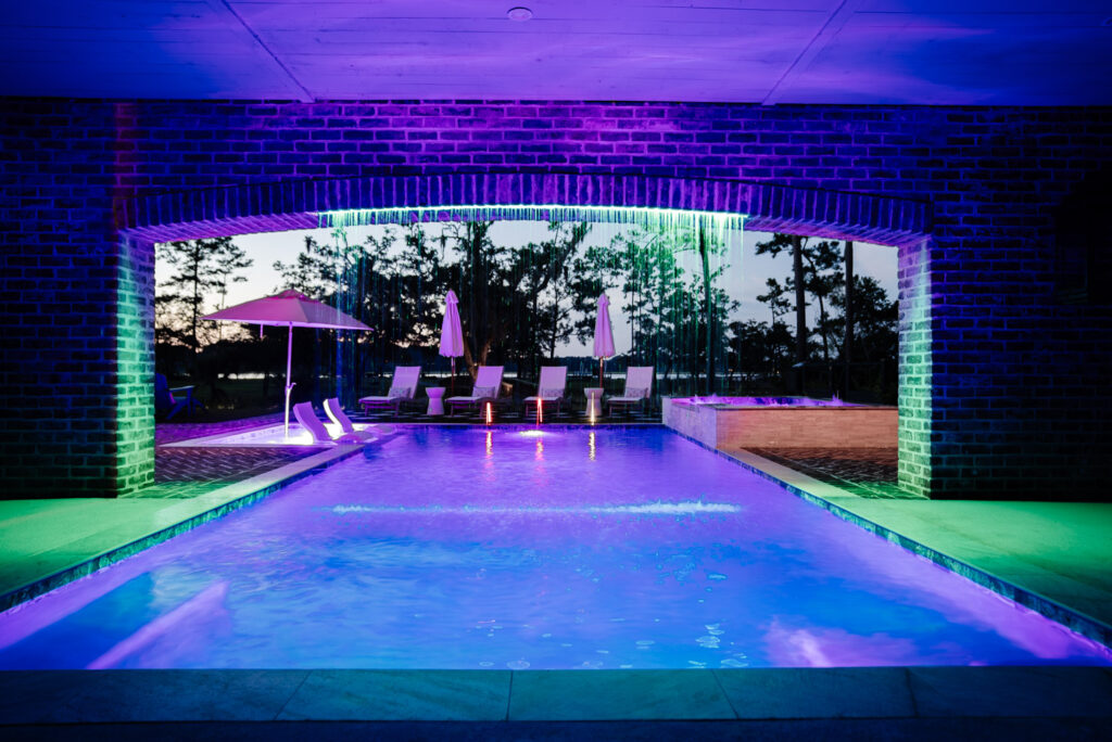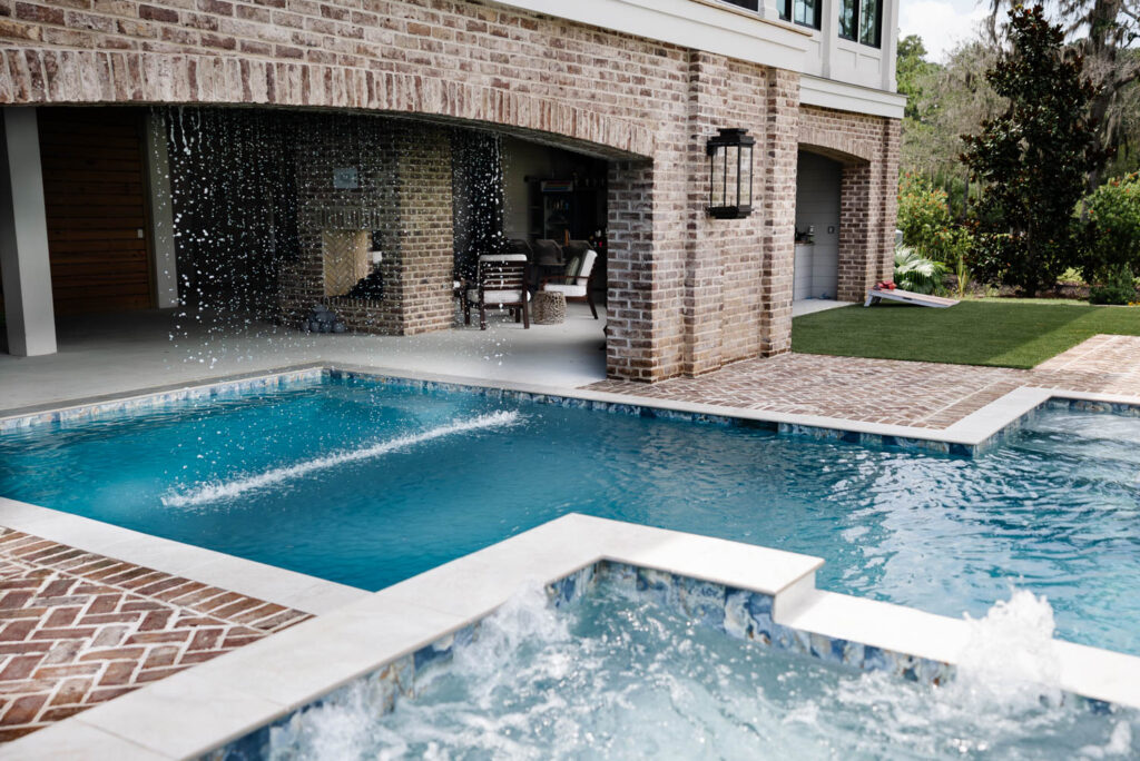 When the sun goes down, things really light up. The pool transforms into an evening showstopper, complete with a custom rain curtain cascading from arched brickwork, glowing laminar jets, and a 10-foot spa that practically begs you to unwind with a cocktail in hand. Coastal-approved finishes like ocean-blue waterline tile and sleek porcelain coping were selected to match the homeowner’s fun and active lifestyle. This pool was built to handle the elements and designed to turn heads.