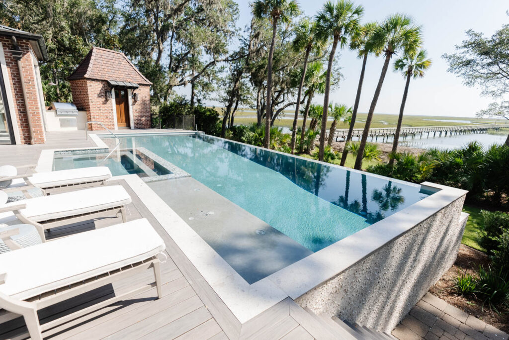 Tucked back in Colleton River is a picturesque view of the low country. In the renovation plans of the existing home, the client desired to elevate the home and exterior to mirror their classic style. The project involved the demolition of an old pool and deck in order to enlarge the pool footprint for the homeowners desire of both exercise and family enjoyment. The design team sourced the perfect color ways to highlight the infinity edge beauty and the low country marsh. The deck was rebuilt using a composite decking to withstand the environment. The pool coping is a old world tabby to draw in the materials used in the home interior.